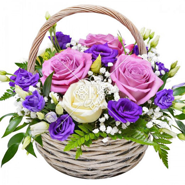 роза аква (возможна замена на розовую) – 3 шт., роза белая – 2 шт., эустома фиолетовая – 3 шт., эустома белая – 2 шт., гипсофила, декоративная зелень, оазис, корзина малая. Представлен на фото.